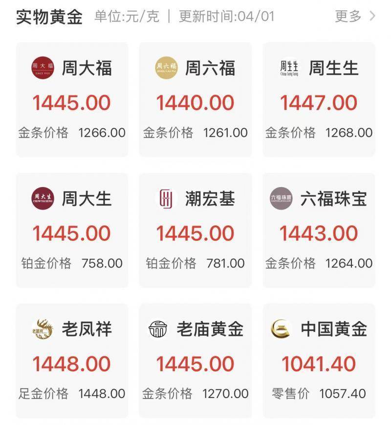 受国际金价上涨影响,国内品牌金饰克价重回1400元上方。4月1日,周大福黄金价格报1445元/克,六福珠宝报1443元/克,周六福报1440元/克,均较前一日上涨50元/克。