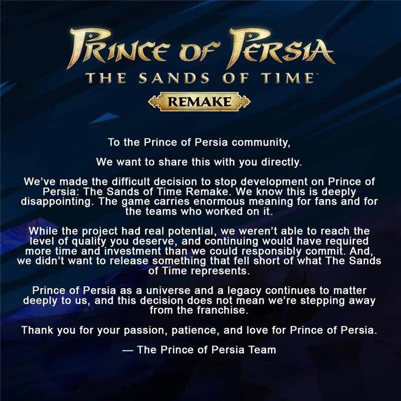1月22日,《波斯王子》官方账号发布正式通告,确认《波斯王子:时之砂 重制版》(以下简称《时之砂RE》)项目的开发工作已经停止。