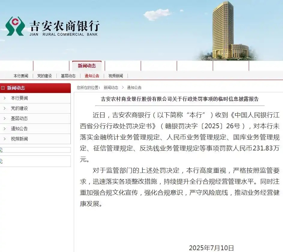 2025年7月,吉安农商银行公告称,收到《中国人民银行江西省分行行政处罚决定书》(赣银罚决字〔2025〕26号),对银行未落实金融统计业务管理规定、人民币业务管理规定、国库业务管理规定、征信管理规定、反洗钱业务管理规定等事项罚款人民币231.83万元。