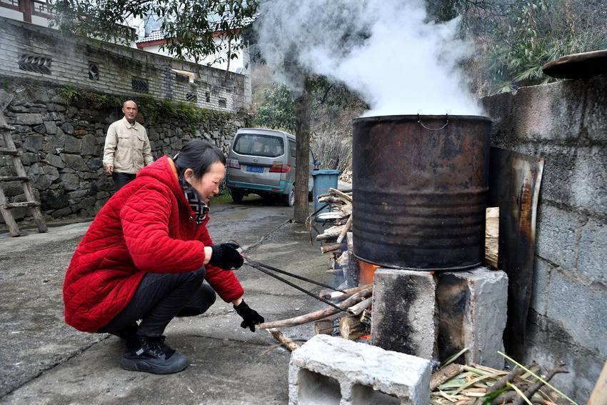 天刚蒙蒙亮,肖俭升和老伴姜吉莲便开始忙碌起来:生火烧水、清扫场地,腰盆、箩筐等用具一一准备妥当。早上8时许,柴火灶上的水翻滚沸腾,左邻右舍、亲朋好友也陆续赶来帮忙,小院里顿时热闹起来。鞭炮声起,几名村民默契配合,将肥猪赶到门前空地的特制夹板上固定好,杀猪师傅手起刀落,干净利落地完成宰杀、取血。