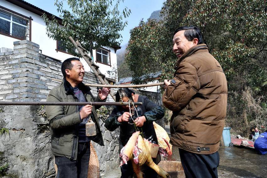 得知肖俭升家杀年猪,在保康县城做装修生意的城关镇小沟村村民舒友华特意赶来,一边帮忙搭手,一边兑现提前的预订。“早就听说他家是纯粮食喂猪,肉好吃又放心,特意提前订了。我老家就在附近,回来买点肉,顺便搭把手,乡里乡亲就该互相帮衬。”舒友华说。