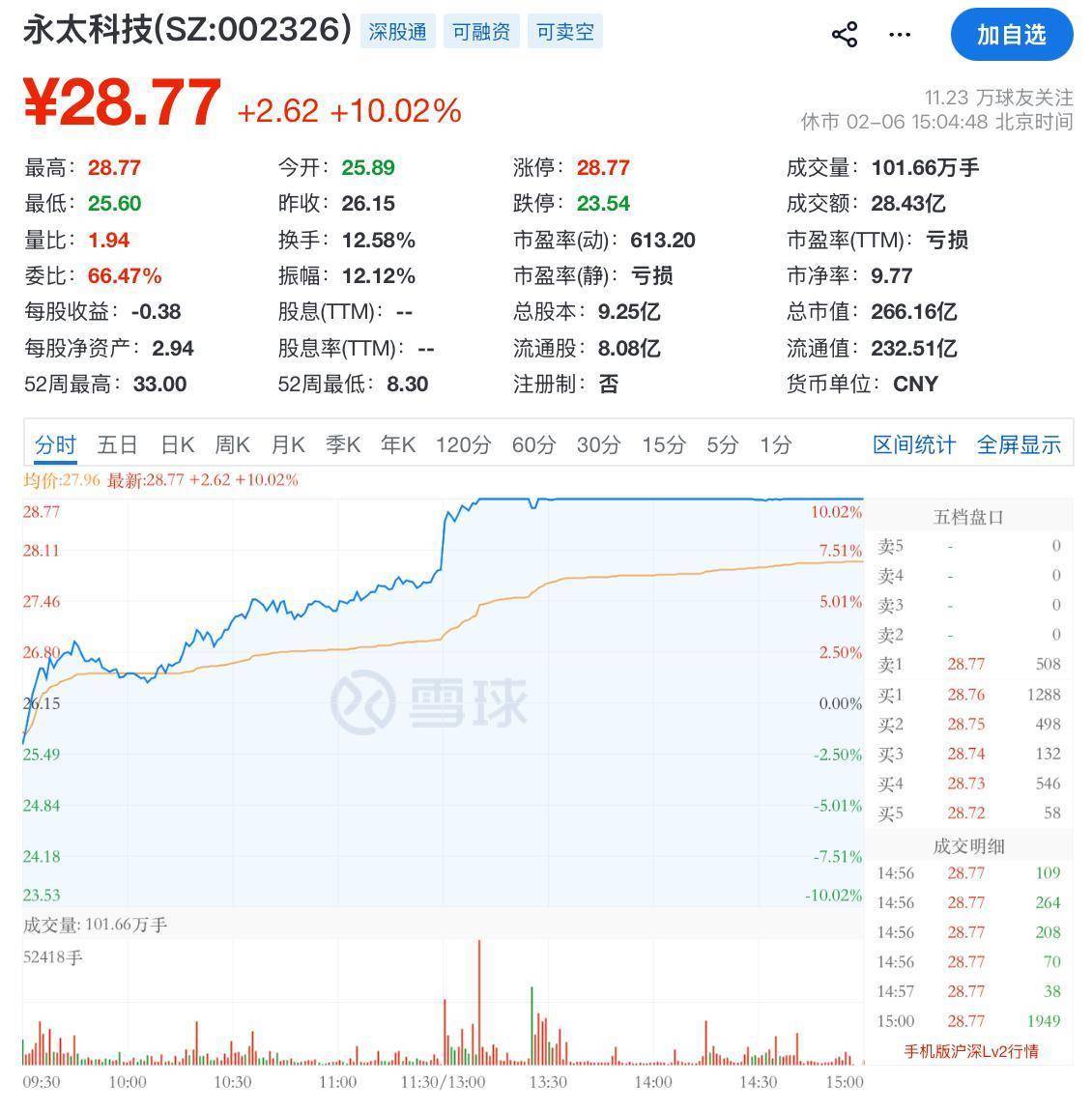 停牌前夕,永太科技股价出现涨停,2月6日,公司股价盘中大幅拉涨,并以涨停收盘,报收28.77元/股,市值266亿元。