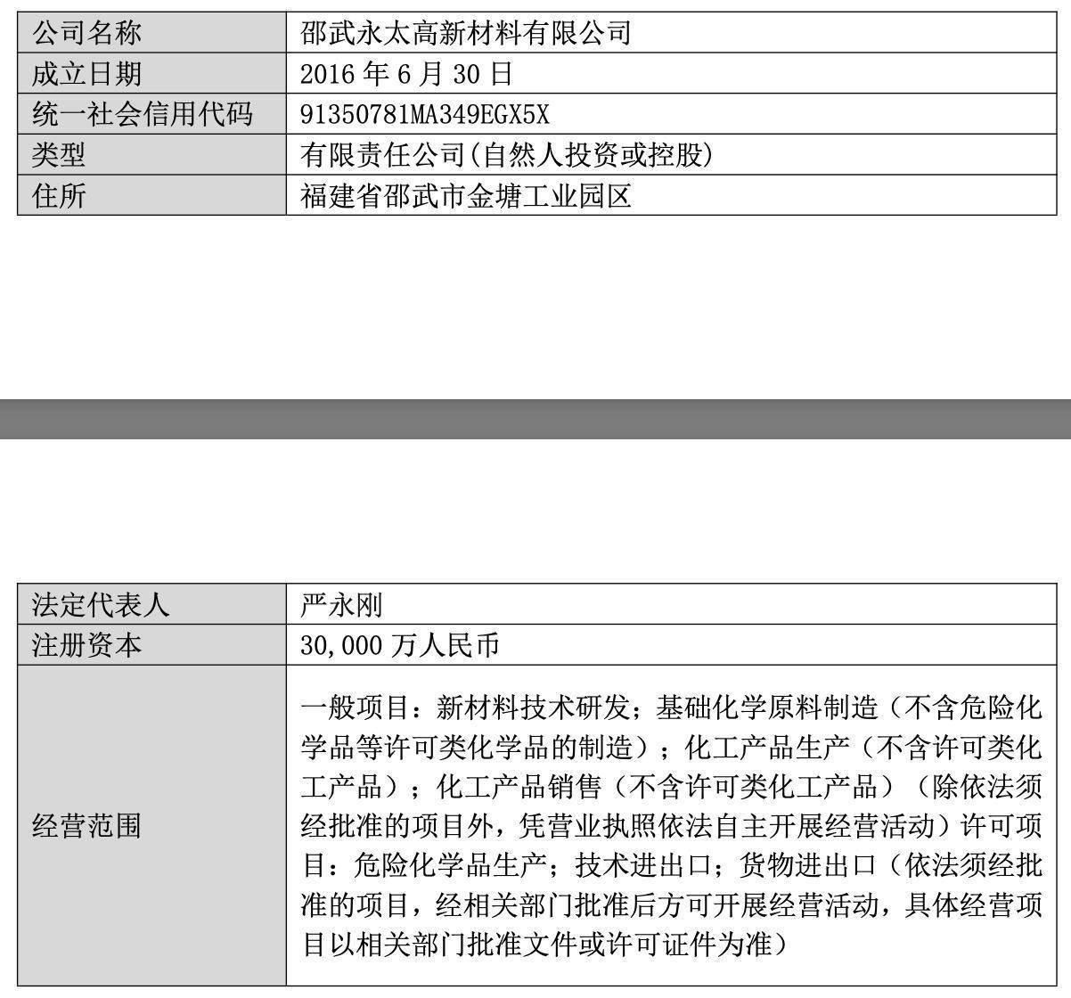 资料显示,永太高新成立于2016年6月30日,法定代表人为严永刚,注册资本为3亿元,公司经营范围包括新材料技术研发、基础化学原料制造(不含危险化学品等许可类化学品的制造)、化工产品生产(不含许可类化工产品)等。