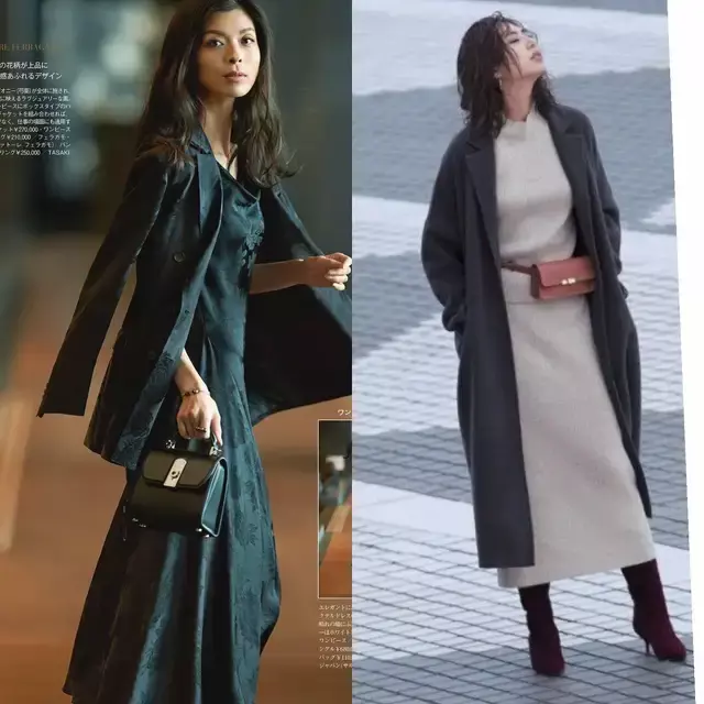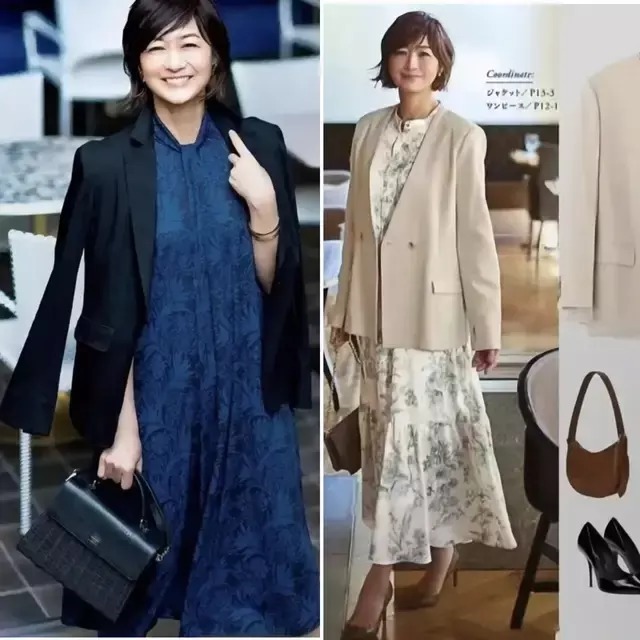 当然,我们还可以用灰色的西装外套搭配上一条藏蓝色的高腰收腰连衣裙,能更容易地呈现出轻熟风的气质,利落高级,正式场合也不失气场。