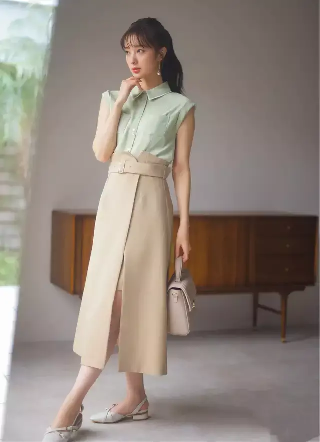 一件浅绿色的衬衫搭配卡其色的直筒半身裙,脚踩一双低跟单鞋,这样的打扮是职场精英都爱的百搭款。