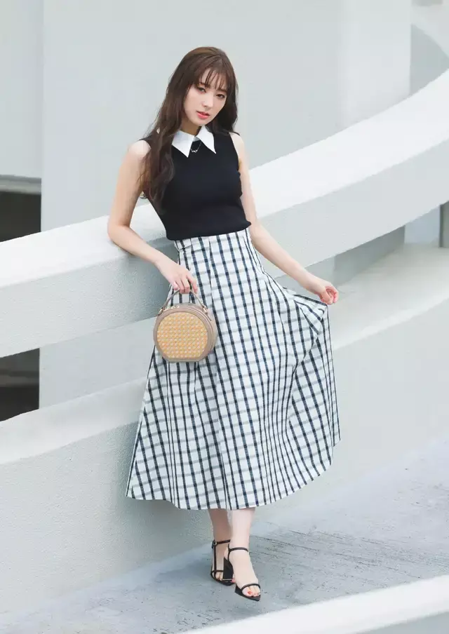 一条自带柔光滤镜的格纹伞状半身裙,搭配上一件无袖的黑色针织上衣,叠穿白色衬衫,上身效果美如初恋。