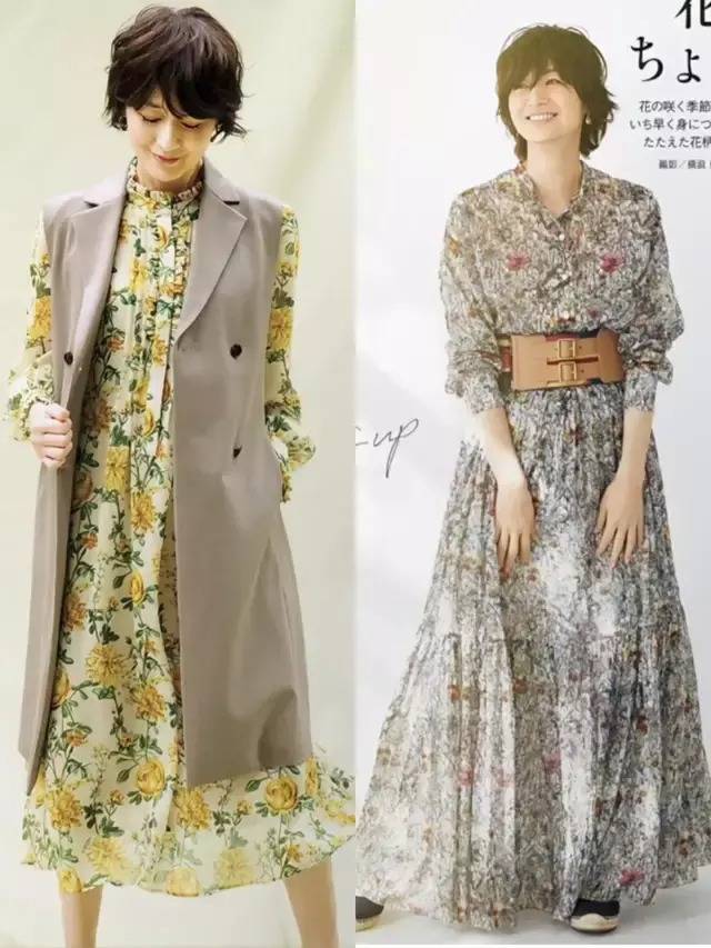 年龄在奔四奔五的阶段,可选一条碎花或者是印花的连衣裙来穿搭,自带春天的轻盈氛围感。